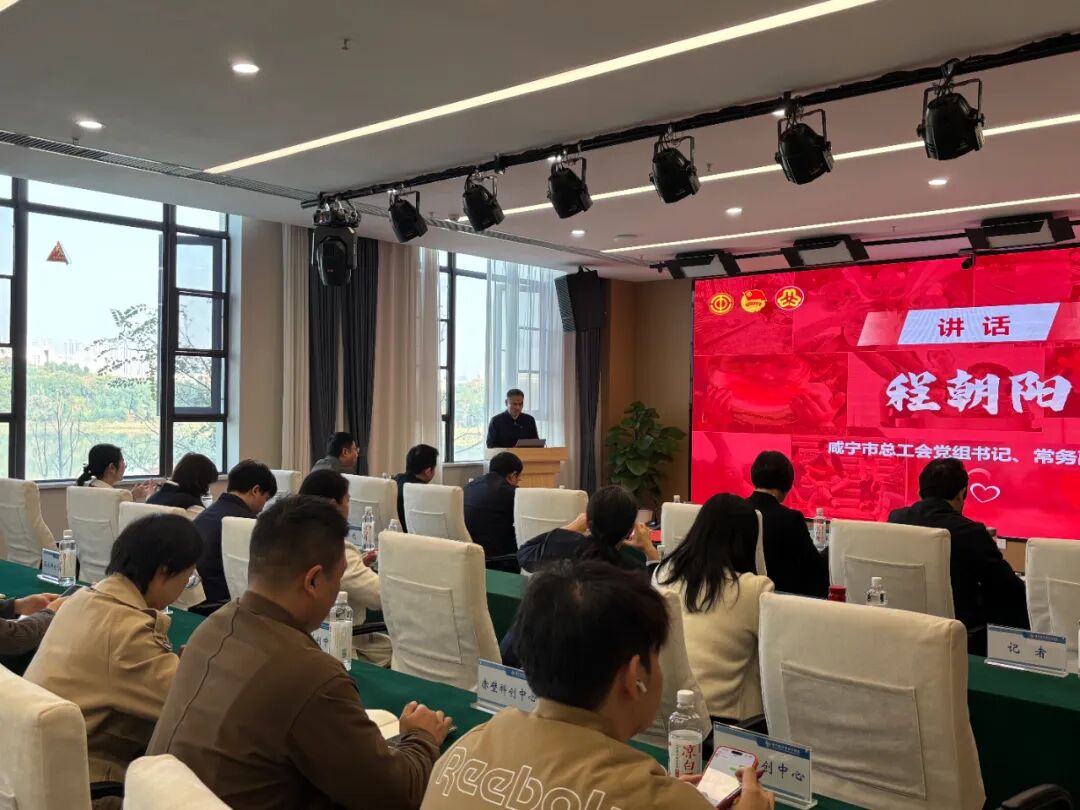 程朝阳在讲话中向咸宁(武汉)离岸科创园工会联合会的成立表示热烈祝贺,并向园区全体会员致以诚挚问候。程朝阳指出,咸宁(武汉)离岸科创园作为咸宁发展的重要支点,采用“政府主导、部门管理、平台投资、专业运营”模式,致力于加速项目孵化和科研成果转化。他强调,科创成果的绽放离不开创新生态的滋养和职工力量的托举,跨区域协同深化也依赖工会组织的黏合作用。工会联合会的成立,将成为链接人才需求与园区服务的关键纽带,既能把园区的技术扶持、金融助力等优势转化为职工成长的养分,也能将职工的创新想法和权益诉求有效转化为园区优化服务的动力。